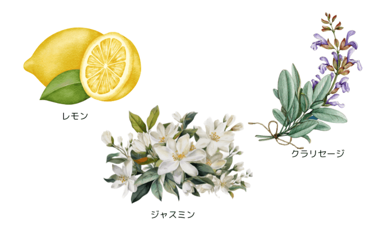 仕事や公的な活動で疲れたときに、家に帰って、優しく迎えくれて癒してくます。月は心の安定、沈静に関わり心や感情の波を落ち着かせます。クラリセージで心を落ち着かせリラックスを促し、レモンで気持ちをクリアにさせた後に、ジャスミンで心を豊かに幸福感を与えます。